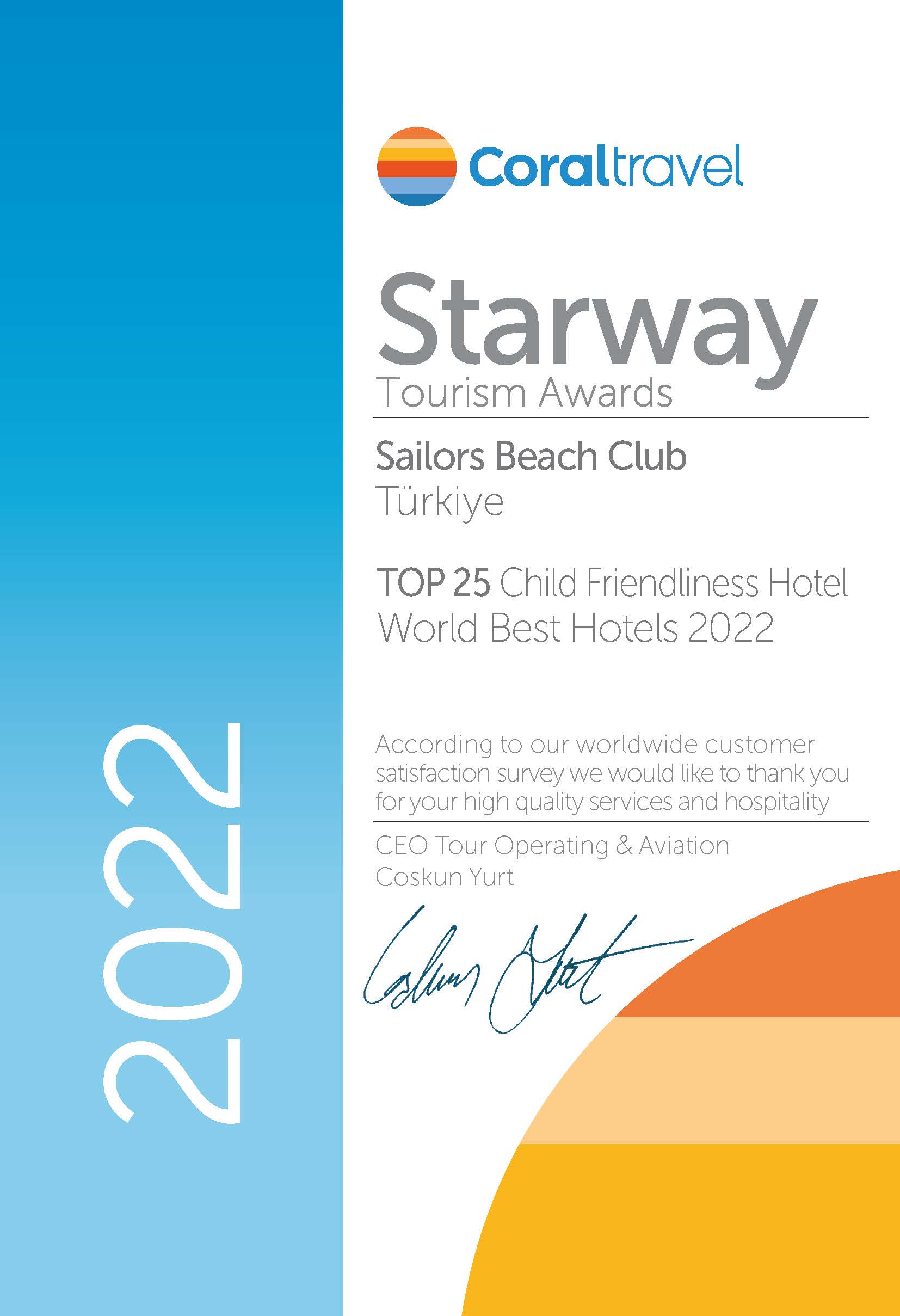 Coral Travel Starway Tourism Awards TOP 25 Child Friendliness Hotel World Best Hotels 2022