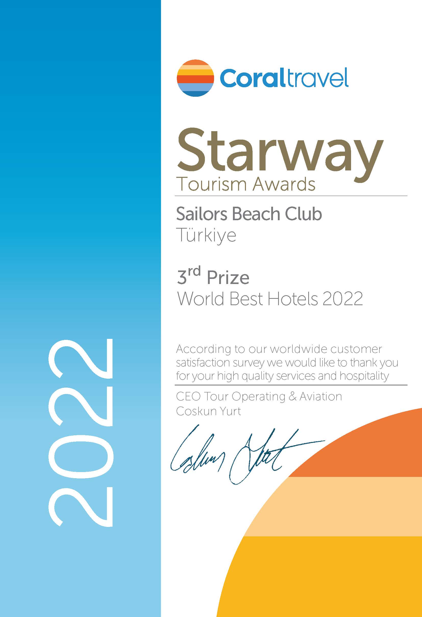 Coral Travel Starway Tourism Awards 3 rd Prize World Best Hotels 2022