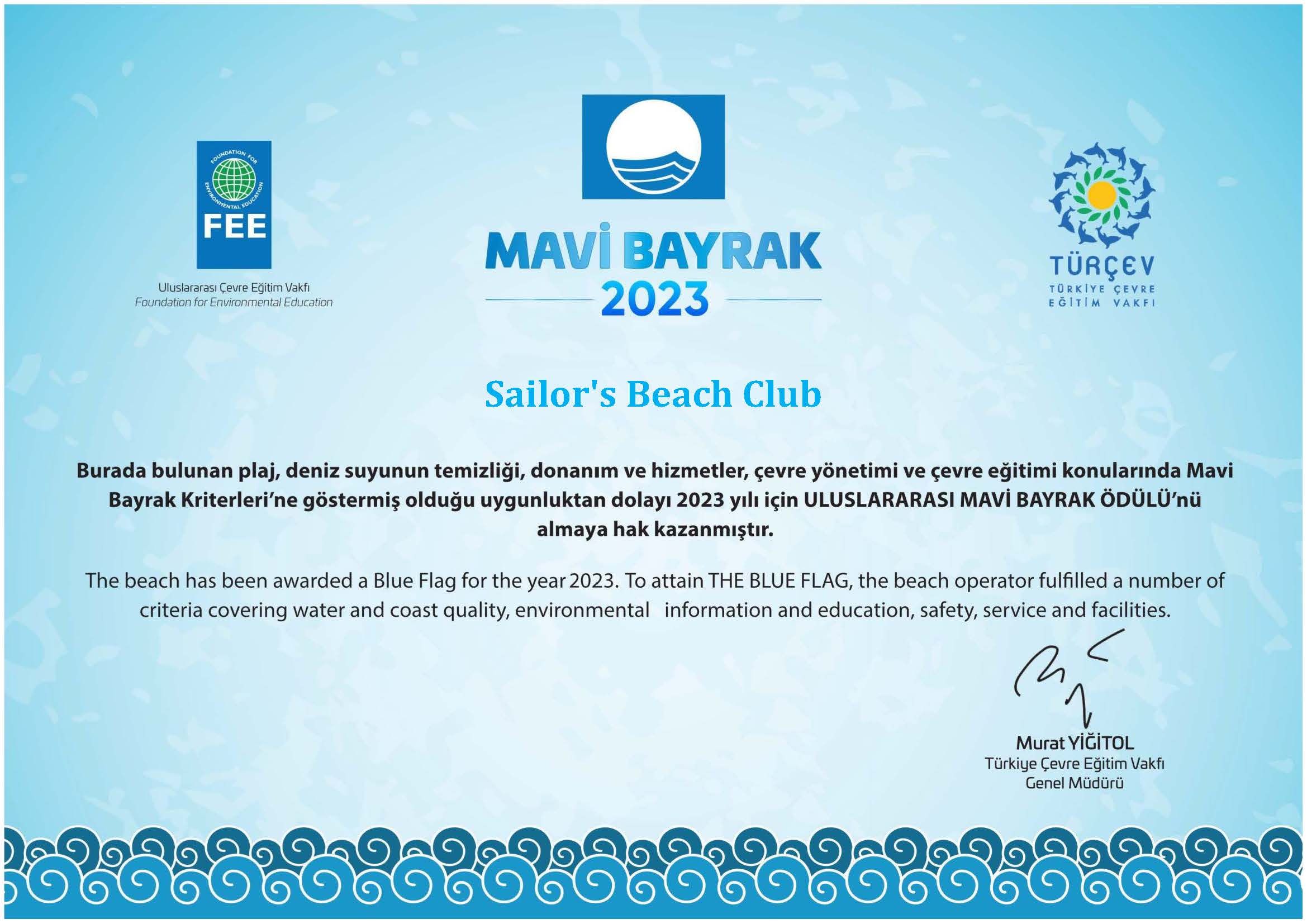 Uluslararası Çevre Eğitim Vakfı TÜRÇEV Türkiye Çevre Eğitim Vakfı Uluslararası Mavi Bayrak Ödülü 2023
